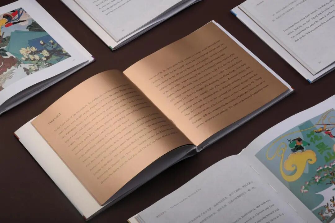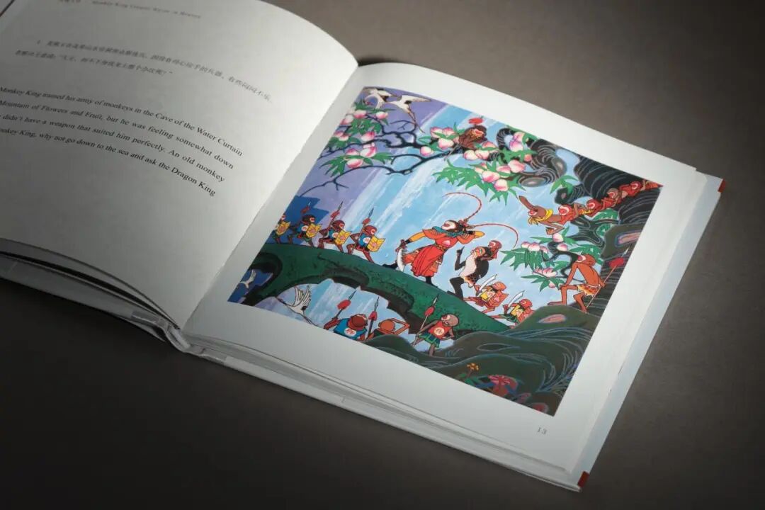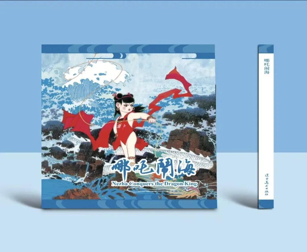 另一侧的《哪吒闹海》插图更添灵动:哪吒足踏风火轮,衣袂翻飞间融入民间年画的稚拙与工笔重彩的细腻,火焰的红与海水的蓝形成冷暖对比,完美融合。40年的沉淀与焕彩,中国装饰画艺术中色彩与构图的创新大胆与传统考究完美结合,让国际观众直观感受中国连环画的传承创新。