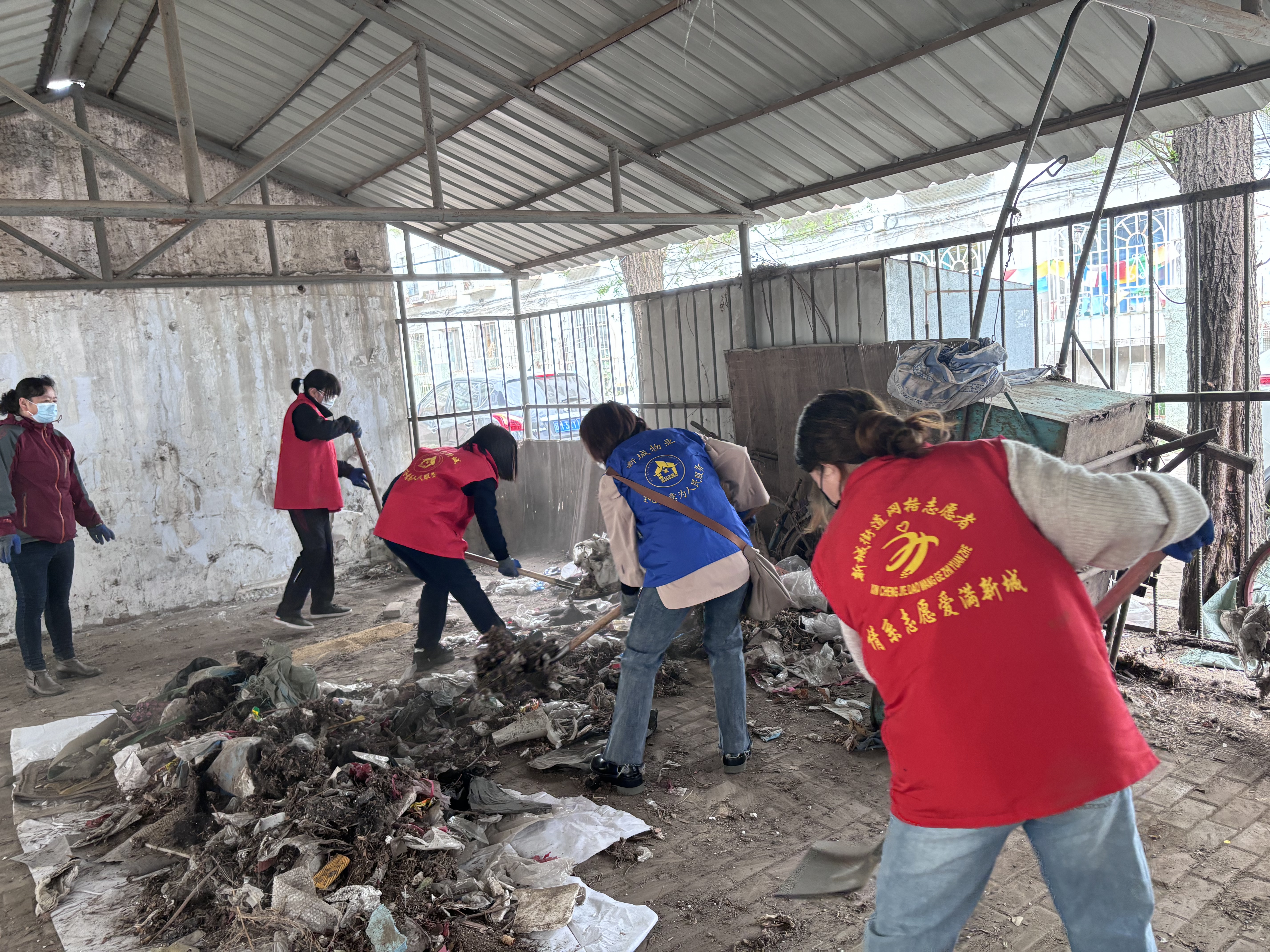 社区工作人员、物业管理员共同清理建设西街5号小区车棚垃圾